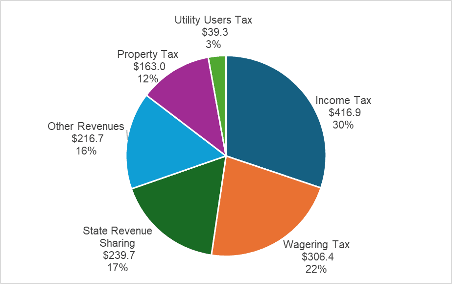 The city’s General Fund receives revenues from various city taxes, state revenue sharing, and other revenues from city fees, fines, and investment earnings (see Chart 1). General Fund revenues support a variety of city operations, programs, and services.