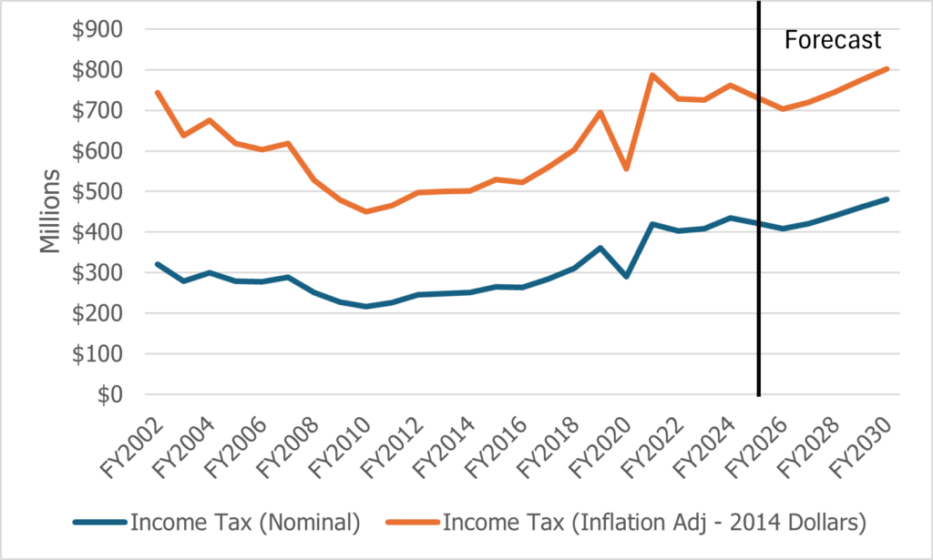 Reviewing the February forecast numbers while considering modest annual inflation (2 percent per year) shows little annual growth in the real value of income tax revenue at 0.7 percent. This might be considered a slightly optimistic projection given that between FY2023 and FY2025, inflation-adjusted revenues fell 4.6 percent annually.
